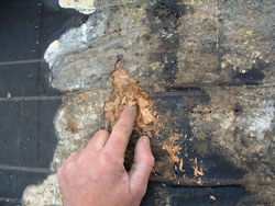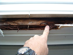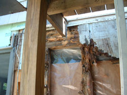This damage is a result of a lack of flashing and a door pan. This happens to be a second story door, and as you can see it got contagious in hurry. The first floor framing, wall coverings, insulation, trim etc. all had to be replaced and or removed. First floor repairs are no better. They result in crawl space or basement work, propping the floor and replacing floor framing, floor coverings etc.